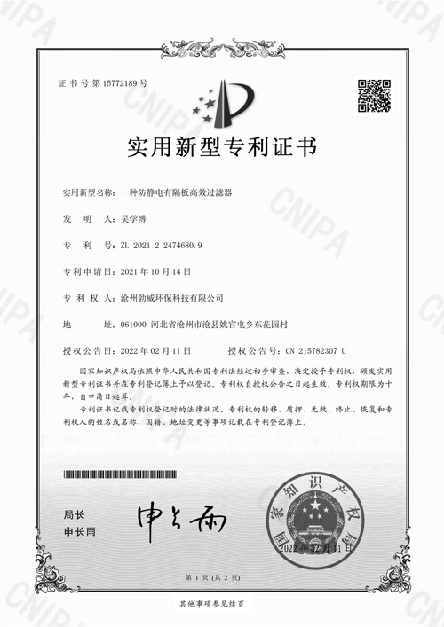 • 防靜電有隔板高效過濾器專利